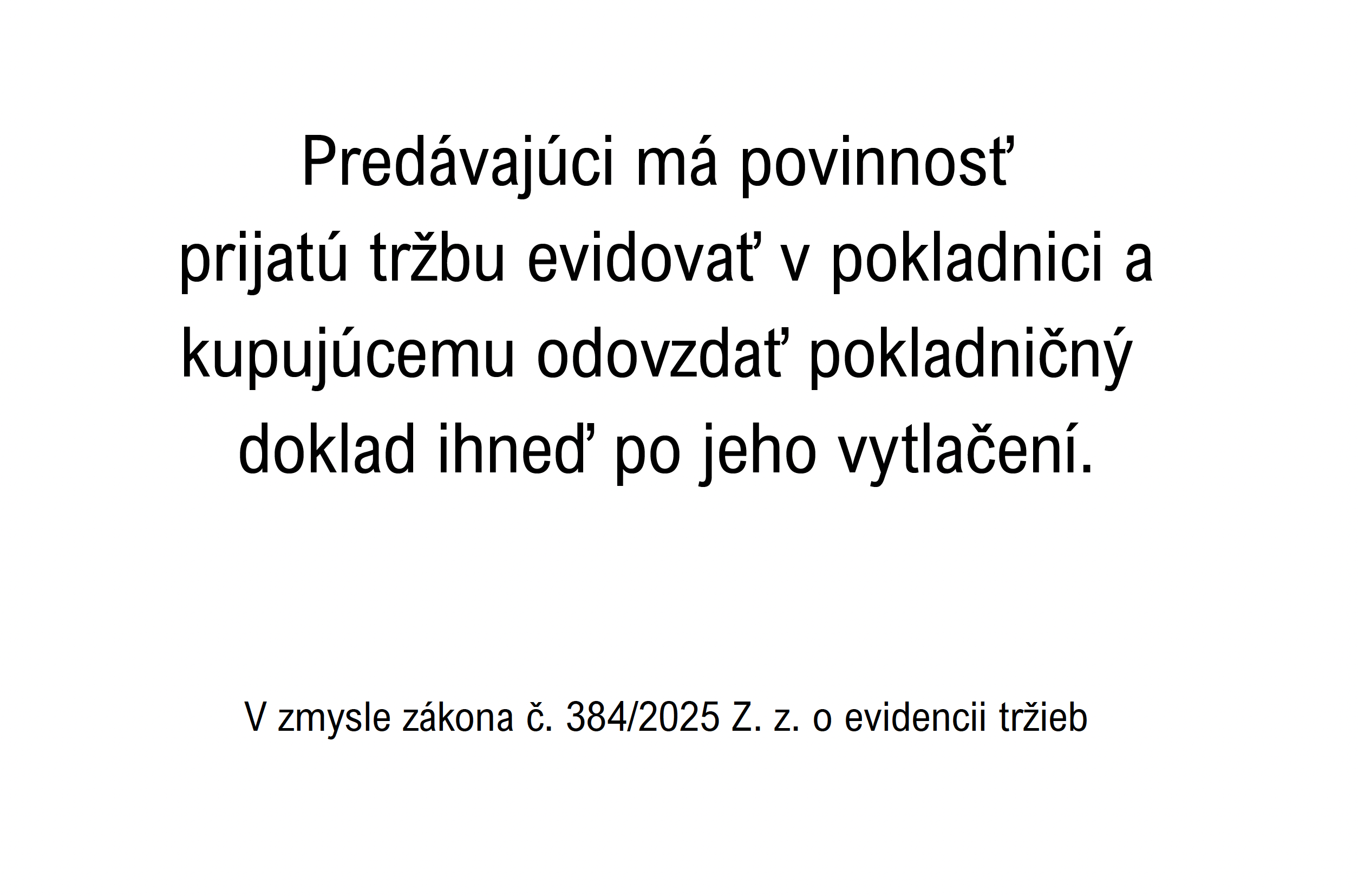 5. Pre prenosné pokladnice: Oznámenie je potrebné umiestniť, tak aby bolo zreteľné a viditeľné pre kupujúceho, kde sa očakáva interakcia s ním napr. na stôl, na čelné sklo automobilu, z ktorého sa uskutočňuje predaj, alebo umiestnené v blízkosti prenosnej pokladnice. Predávajúci môže oznámenie predložiť kupujúcemu k nahliadnutiu.